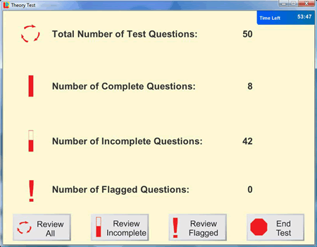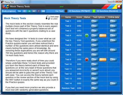 - 14 properly balanced pre-set simulated Theory Tests based on our extensive experience (as one of the largest national driving schools in the UK) of the most commonly occurring test questions all under realistic exam conditions.